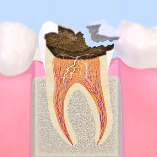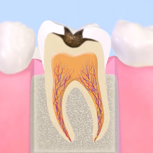むし歯が大きな穴になって象牙質のすべてに及び、神経まで達したむし歯です。何もしていなくてもズキズキと激しい痛みを感じるようになります。