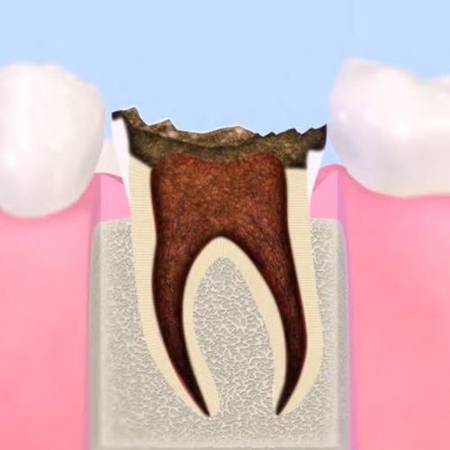 歯のほとんどが崩壊した状態です。歯の根まで細菌に感染し化膿した状態です。このままにしておくと神経が腐敗し、歯周病が悪化し、抜歯のリスクが高まります。