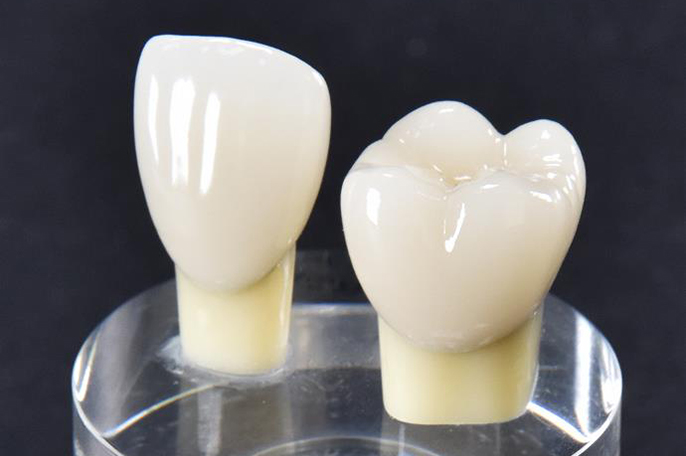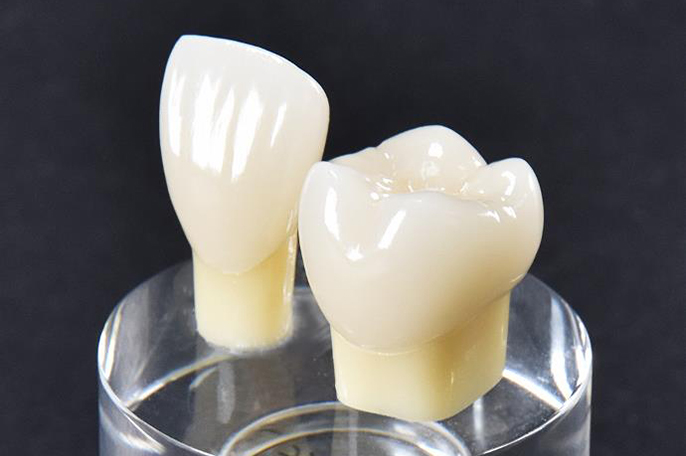 人工ダイヤモンドとも呼ばれるジルコニアでできている被せ物です。高い強度があるため金属による補強の必要が無く、咬み合わせの強い部位にも使用できます。金属アレルギーの心配もありません。白色で変色しにくく、汚れ(プラーク)が付きにくいという特長があります。