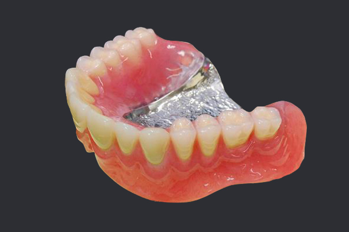 粘膜と密着させる部分が金属製の入れ歯です。保険適応のプラスチック製入れ歯は一定の厚みが必要となりますが、金属を使用することで薄く制作できるため、装着感が良いものをご提供できます。また熱が伝わりやすいため、美味しく食事が楽しめます。