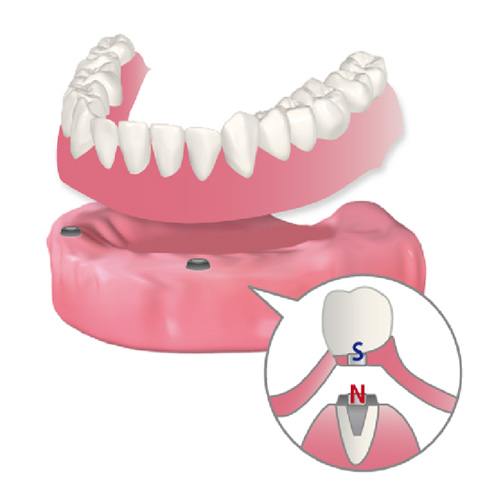 部分的に残っている歯に磁石性のアタッチメントを取り付け、入れ歯を固定する方法です。取り外しが簡単なので清掃が容易で入れ歯を清潔に保てます。また、入れ歯が比較的小さくできる、アタッチメントでしっかりと固定するので安定して噛みやすくなるなどのメリットがあります。