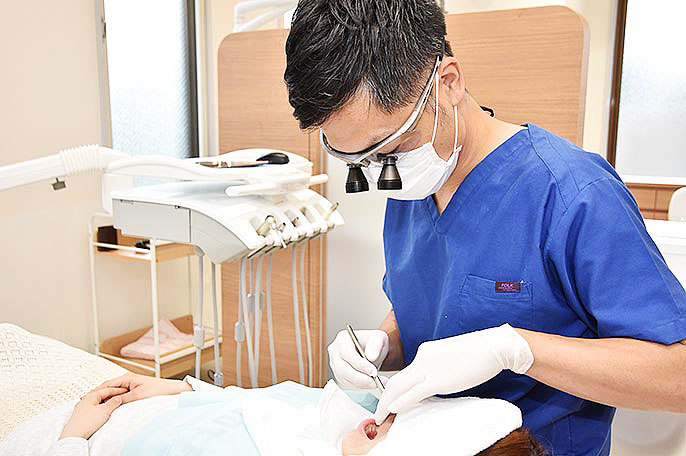 自分にあった入れ歯で食事をすることは心の安定に繋がるのです。当院では、院内で微調整が可能ですので、患者さんの症状にあわせた入れ歯をスムーズに作成し、合わない入れ歯を調整することができます。入れ歯でお悩みの方は一度当院にご相談ください。また、年齢と共に通院が難しくなってきた方には訪問診療にて治療や入れ歯の作成を行ってまいります。