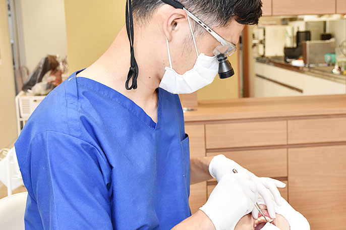 歯の土台が健康であれば、ご自身の歯を長く残すことができます。当院ではなるべく抜歯をせず、歯内治療(歯の根の治療)を行うことで、患者様ご自身の歯を可能な限り残せるよう努めています。治療の際は、まず歯の内部の細菌感染部分をきれいに除去する必要がありますが、根管は細く複雑な形状の場合があるため、高度な技術を要します。